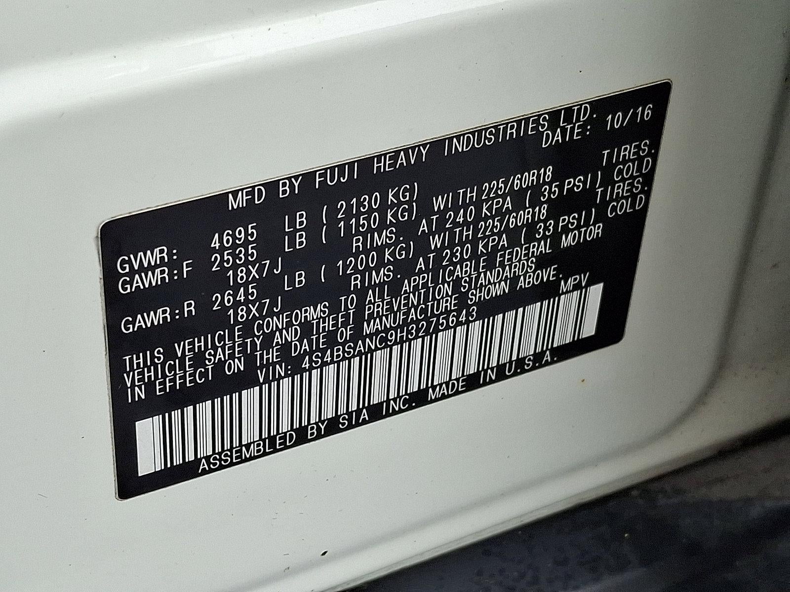Recent Arrival! 2017 Subaru Outback 2.5i Limited Crystal White Pearl *Schedule a test Drive at your home or office*, 12 Speakers, 4-Wheel Disc Brakes, 4.111 Axle Ratio, ABS brakes, Air Conditioning, Alloy wheels, AM/FM radio: SiriusXM, Anti-whiplash front head restraints, Auto-dimming Rear-View mirror, Automatic temperature control, Brake assist, Bumpers: body-color, CD player, Compass, Driver door bin, Driver vanity mirror, Dual front impact airbags, Dual front side impact airbags, Electronic Stability Control, Emergency communication system, Exterior Parking Camera Rear, Four wheel independent suspension, Front anti-roll bar, Front Bucket Seats, Front Center Armrest w/Storage, Front dual zone A/C, Front fog lights, Front reading lights, Fully automatic headlights, Garage door transmitter, harman/kardon Surround Sound Speaker System, harman/kardon® Speakers, Heated door mirrors, Heated front seats, Heated rear seats, Heated Reclining Front Bucket Seats, Illuminated entry, Leather Shift Knob, Low tire pressure warning, Memory seat, Occupant sensing airbag, Outside temperature display, Overhead airbag, Overhead console, Panic alarm, Passenger door bin, Passenger vanity mirror, Perforated Leather-Trimmed Upholstery, Power door mirrors, Power driver seat, Power Liftgate, Power moonroof, Power passenger seat, Power steering, Power windows, Radio: Subaru Starlink 7.0" Multimedia Plus System, Rear anti-roll bar, Rear seat center armrest, Rear window defroster, Rear window wiper, Remote keyless entry, Roof rack, Security system, Smartphone Integration, Speed control, Speed-sensing steering, Split folding rear seat, Spoiler, Steering wheel mounted audio controls, Steering-Wheel Paddle-Shift Control Switches, Tachometer, Telescoping steering wheel, Tilt steering wheel, Traction control, Trip computer, Turn signal indicator mirrors, Variably intermittent wipers, Vehicle Information Display, Wheels: 18" x 7.0" Aluminum Alloy w/Machine Finish.